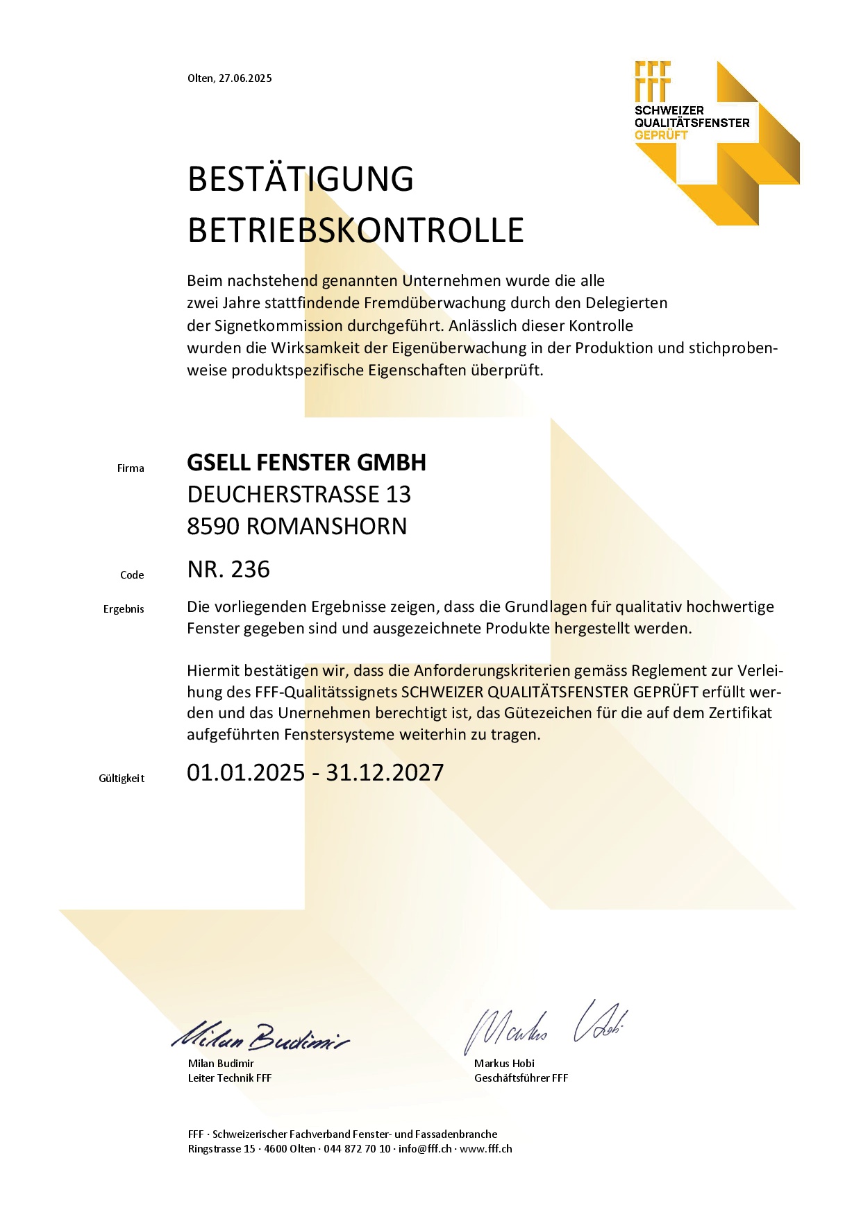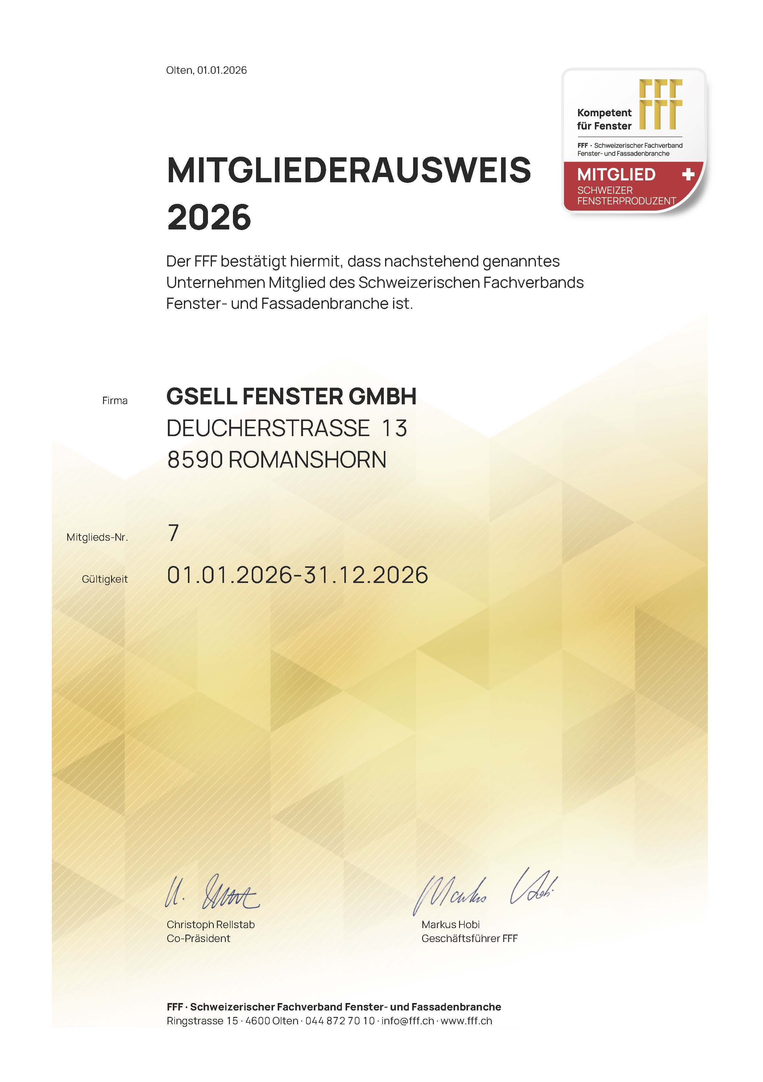 2018 gründete Peter Gsell die Firma Gsell Fenster GmbH und übernahm die Einzelfirma Albert Gsell Fensterfabrik. Im selben Jahr wurde Gsell Fenster GmbH mit dem FFF – Qualitätssignets „Schweizer Qualitätsfenster *geprüft*“ ausgezeichnet.